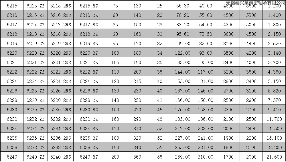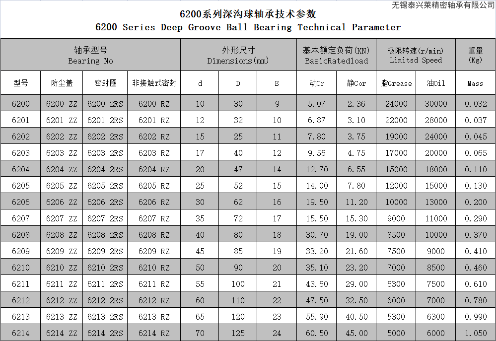 6200系列深沟球轴承技术参数