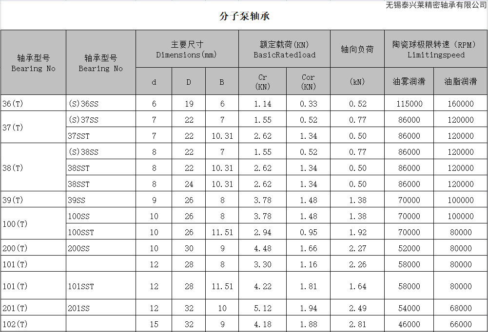 分子泵轴承技术参数